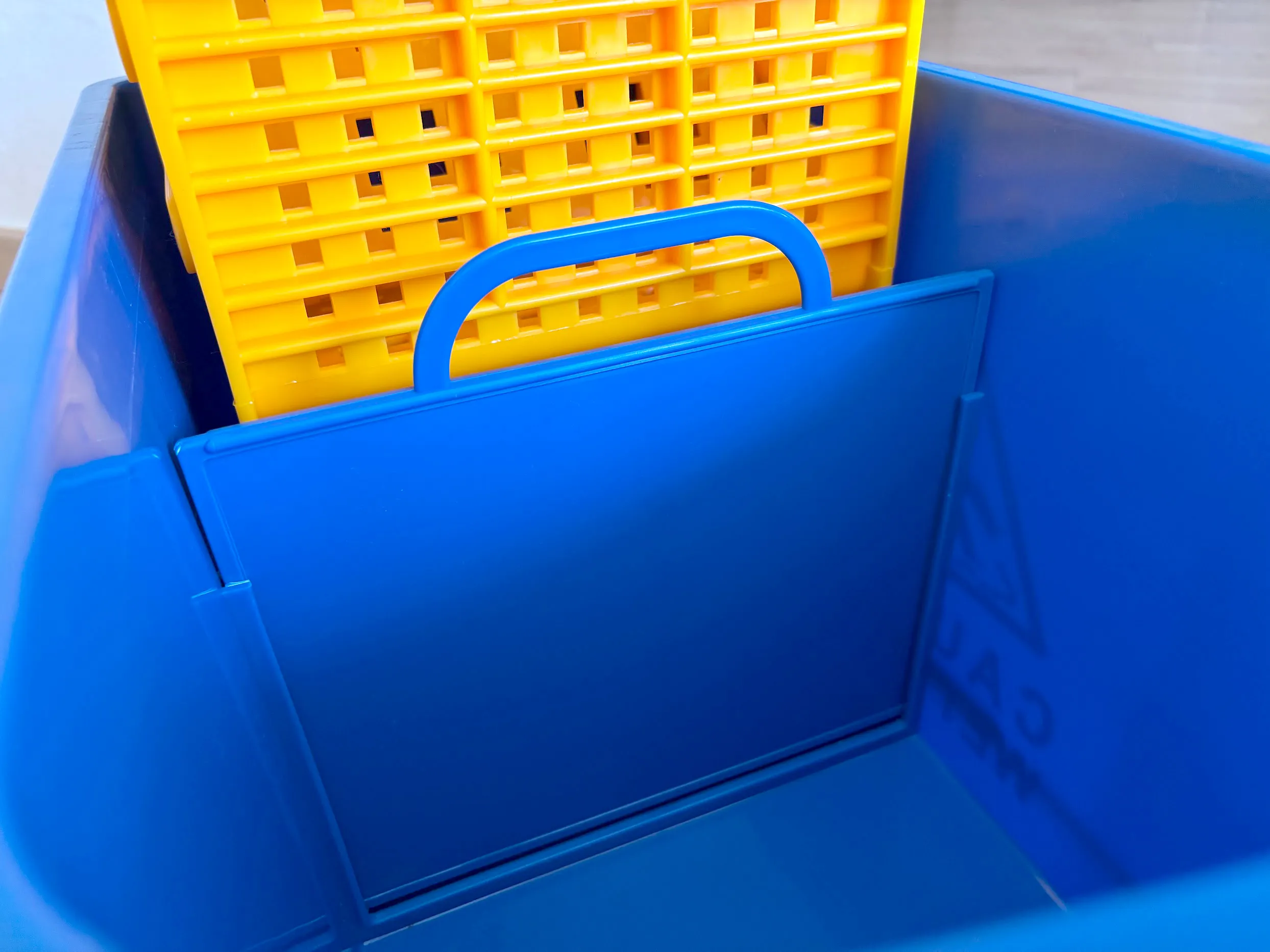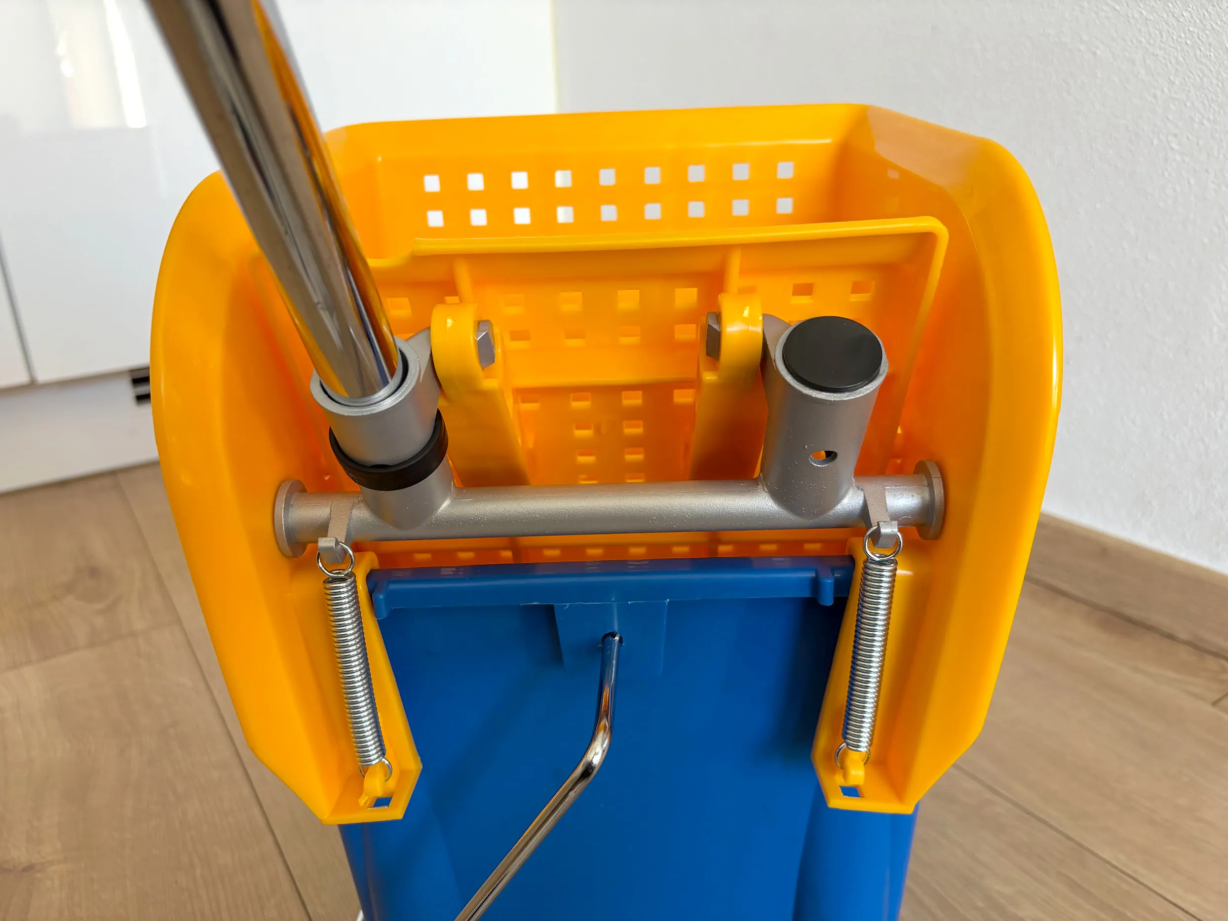 V tomto případě si můžete prohlédnout sadu v kombinaci žluté a modré. Na boku kbelíku nechybí ani praktická nálepka s varováním. Barva je dána skladem e-shopu. Držák je umístěn z obou stran vozíku podélně na středu, díky čemuž je přijde stabilnější na přenášení.