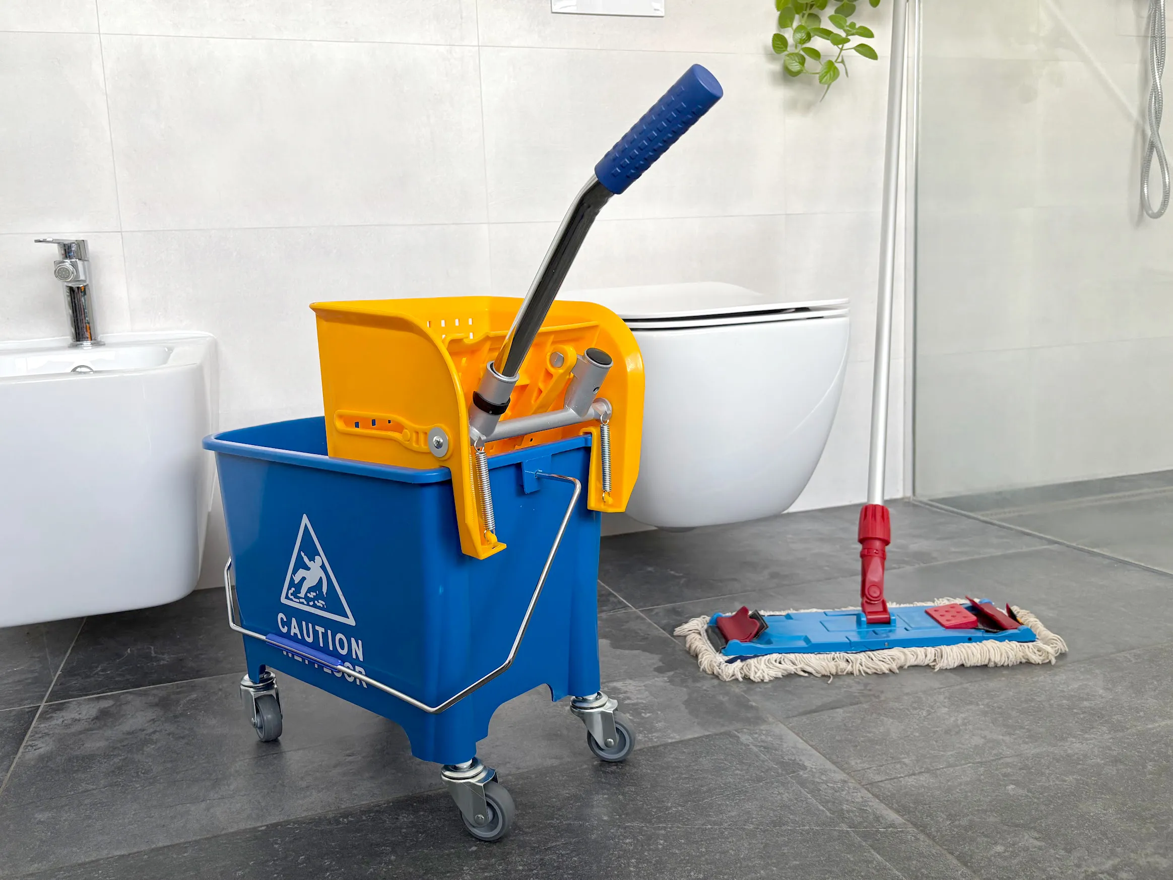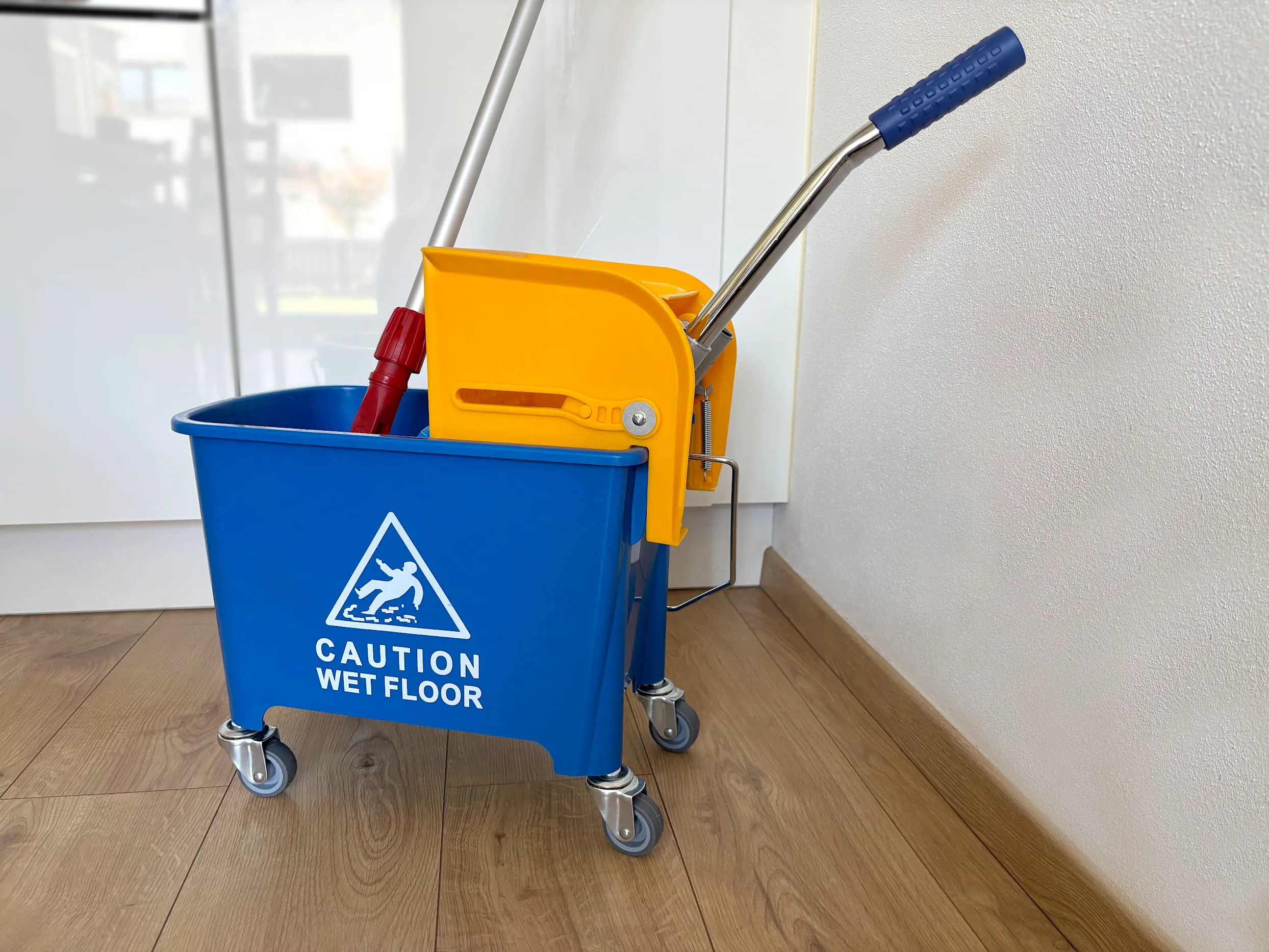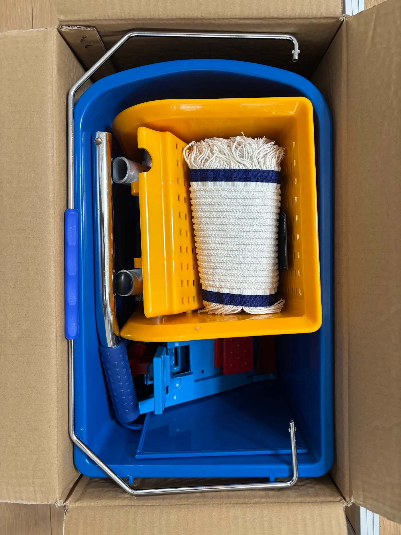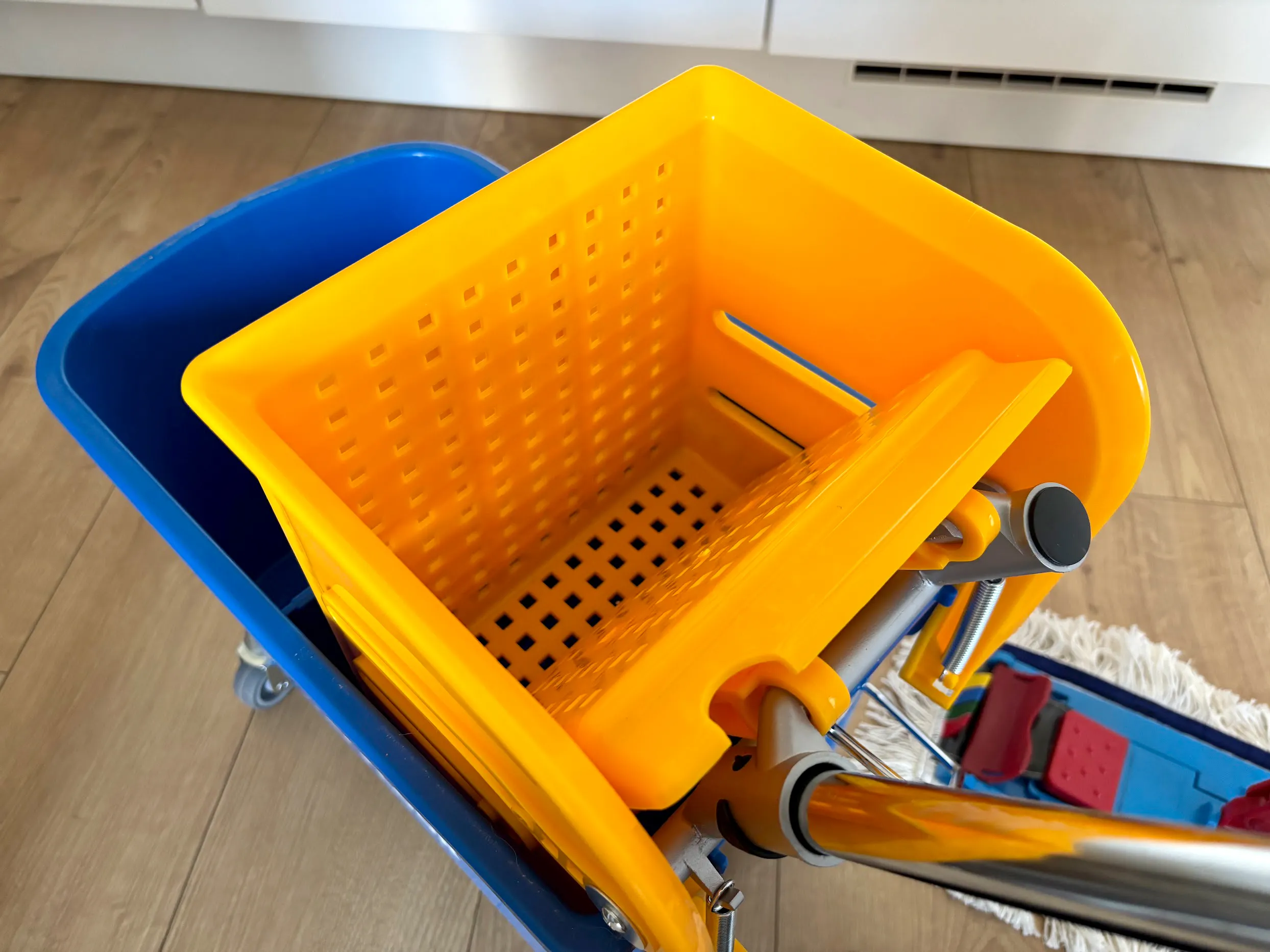 Zasunuli jsme do kbelíku přepážku, přidali prostředek na čištění podlah a napustili teplou vodu. Vše bylo rychle sestavené a připravené k použití.